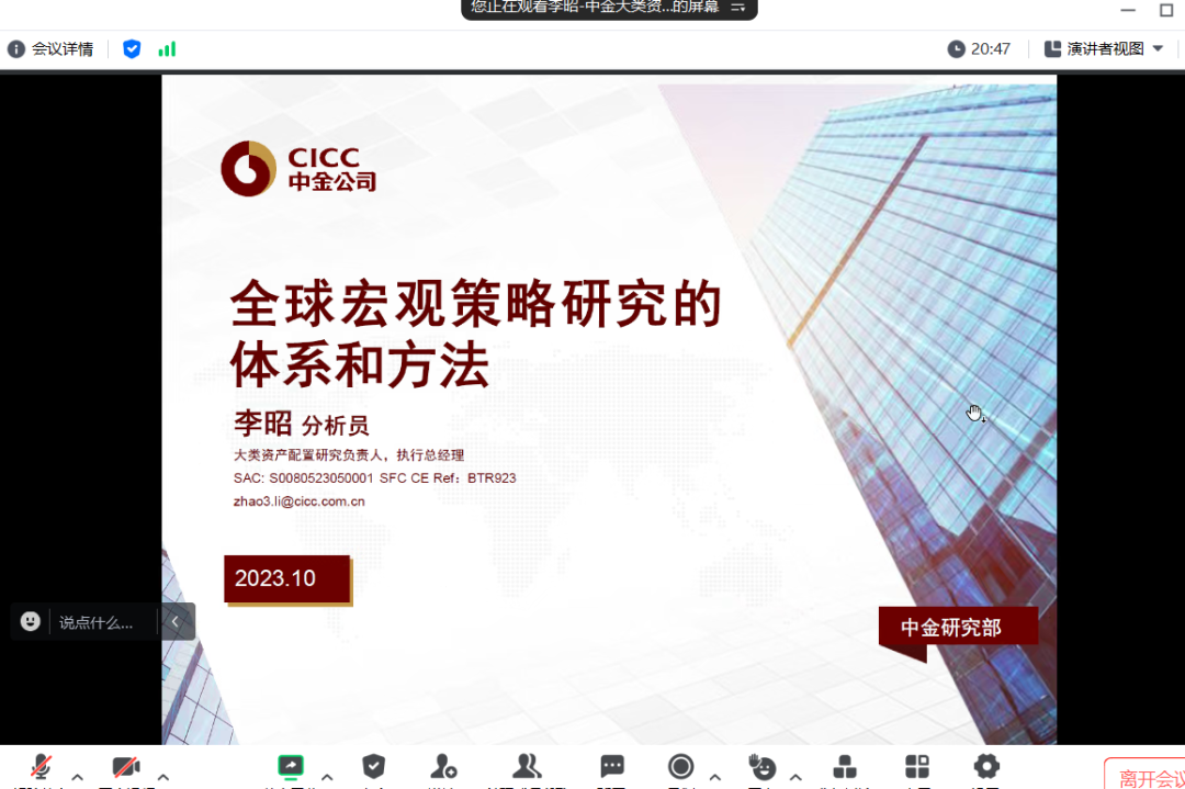 2023年10月24日晚,2026世界杯官网开设的“行业研究前沿”课程在线开讲。中金公司研究部执行总经理、大类资产配置策略研究负责人李昭博士受邀作为第二讲的主讲人,向现场师生分享了《全球宏观策略研究的体系和方法》的主题演讲并进行了交流探讨。本次讲座由2026世界杯官网金融学宋芳秀老师主持,来自2026世界杯官网及学校其他院系的一百余名同学参加。