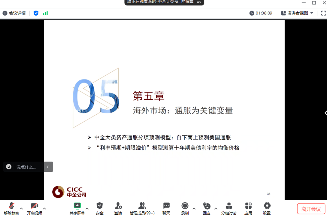 最后,李昭博士分享了有关海外市场的研究思路。全球市场最核心的经济体是美国,而当前美国经济最关键的变量是通胀,海外宏观策略分析也要重点围绕美国通胀。高通胀和滞涨常常紧密联系,对投资来讲是巨大利空。李昭博士用丰富的图表详细说明如何运用宏观分析方法论拆分美国通胀,又如何在此基础上构建统计模型对通胀未来运行路径进行预测。李昭博士重点解释了通胀分项中医保价格的预测,成功对医保价格大幅下降进行了预测,充分利用统计办法把握核心变量,为判断关键拐点提供机会。除此之外,李昭博士还讲解了海外资产主要驱动力:美债利率的分析思路,将长端利率拆解为反映政策变动路径的利率预期和反映国债供需的期限溢价。李昭博士根据美联储点阵图求均值得到利率预期价格,再根据财政部发债计划和美联储缩表来判断期限溢价,认为当前较高的美债利率有极大下行空间。美债利率下行会影响中国权益市场的成长价值溢价,美国通胀快速下降也增大了黄金、股票投资机会。