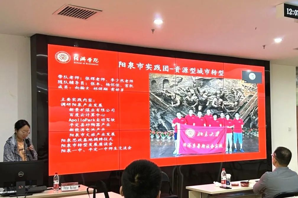 在汇报环节,山西阳泉实践团的同学们以探索资源型城市转型升级为主题,汇报了阳泉市的产业概况,并对其产业转型的内因和发展中存在的问题进行了分析。结合对“资源诅咒”理论的认识与理解,同学们从改善传统工业、壮大高新技术产业和发展文旅产业三个方面探讨了阳泉市转型发展的路径。