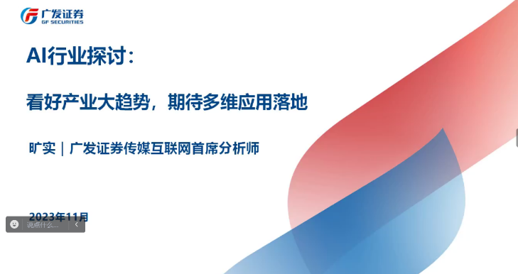 首先,旷实先生对“AI+”产业的源起和技术进展进行了介绍。他将“AI+”产业链分为基础硬件层、模型层以及应用层。基础硬件层的芯片和云服务提供算力支持,模型层支柱是包含多种算法技术的大模型,应用层则囊括文本生成、图像处理等多元场景。旷实先生认为大数据、大算力和强算法是大模型训练的“三驾马车”,大模型是目前业内一致认知的技术路线,海内外大厂具备庞大训练集的天然优势。从2017年至今,AI产业的发展已经从温和竞争升级到超级军备竞赛,海内外大厂陆续发布自研大模型开启商业化落地,AI的迭代速度呈指数式上升。旷实先生全方位介绍了Open AI、谷歌、Meta以及百度的自研大模型技术路径和用户流量,他认为海外AI技术发展更加迅速,以百度为代表的国内大厂已经在快速实现商业化落地。