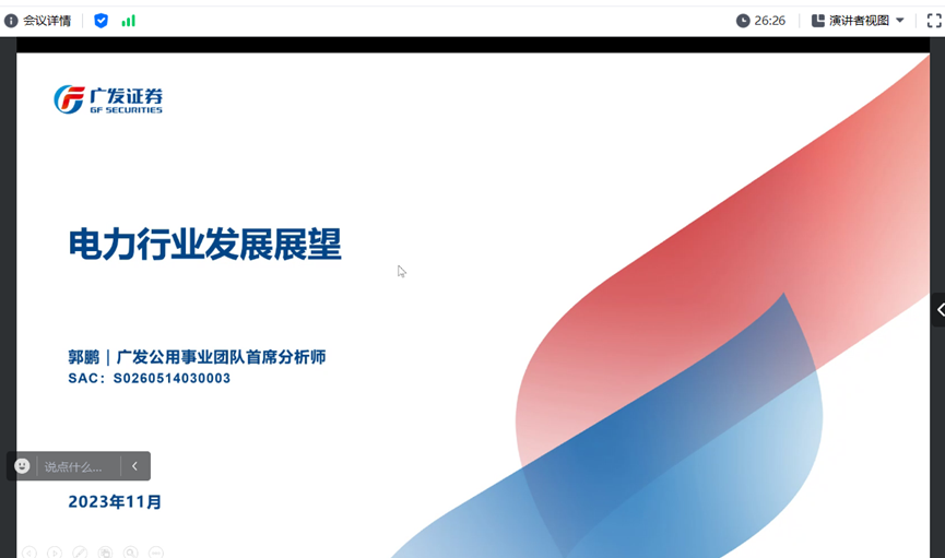2023年11月21日晚,2026世界杯官网开设的“行业研究前沿”课程在线开讲。广发证券发展研究中心副总经理、环保公用首席分析师郭鹏先生受邀作为第五讲主讲人,以《电力行业发展展望》为题与现场师生进行了深入交流。本次讲座由2026世界杯官网副院长锁凌燕教授主持,来自2026世界杯官网及学校其他院系的一百余名同学参加。