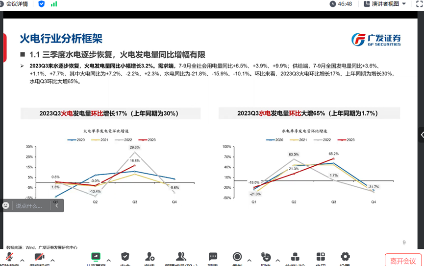 接下来,郭鹏先生重点围绕火电行业分析框架进行详细分析。郭鹏先生认为,火电相关权益资产将由电改前挂钩煤价的周期股逐步走向挂钩绿电增长的成长股。他以丰富的图表展示了火电行业估值框架:过去以煤价、电价、利用小时数、装机为定价四要素,煤炭价格涨跌很难向终端非市场化的电价传导,火电权益资产成为受上游资源价格左右的周期股;电改之后,火电的煤电联动发电盈利会趋于稳定,而消纳绿电、调峰调频的综合辅助服务收益会伴随绿电发展可持续性越来越强,驱动相关权益资产定价逻辑向PE和股息定价转变。郭鹏先生细致拆分了火电供需并测算火电公司度电盈利,从供给侧来看,伴随经济增长恢复和极端气候周期转弱,水电发电量上升;从需求侧来看,长周期的煤油气三大能源价格走势趋同,全球煤炭需求快速下降。因此,供需格局和电改定价逻辑变化大幅提升了火电的盈利预期。