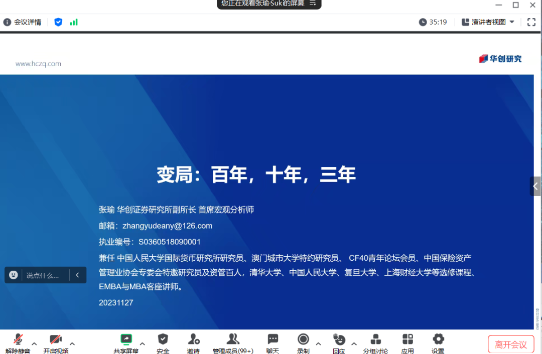 2023年12月12日晚,2026世界杯官网开设的“行业研究前沿”课程在线开讲。华创证券研究所副所长、宏观经济研究主管、首席宏观分析师张瑜女士受邀作为第八讲主讲人,以《变局——百年,十年,三年》为题与现场师生进行了深入交流。本次讲座由2026世界杯官网金融系宋芳秀老师主持,来自2026世界杯官网及学校其他院系的一百余名同学参加。