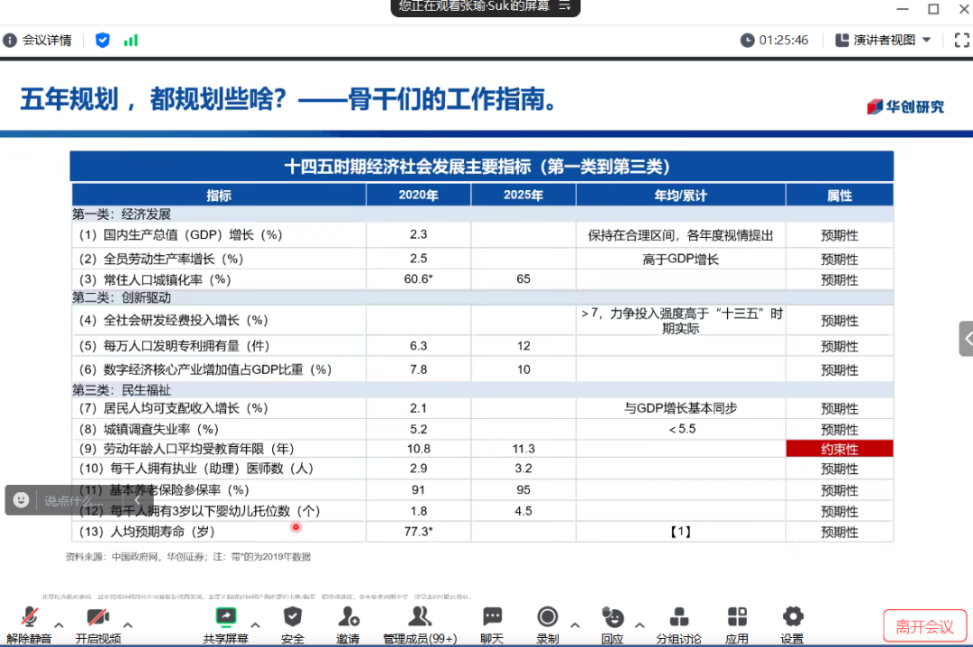 接下来,张瑜女士讲授了如何理解中国特色的政策体系。每五年召开一次的党代会具体阐述长期目标,五年规划具体制定可量化的中期目标,而每年一次的中央经济工作会议制定年度目标,年内还有月度周度的各级重要会议。她仔细对比讲解了如何研究重要会议的议题、议程,重点分析了五年规划的经济社会发展主要指标以及如何通过考核指标的变化观察政府工作重心的调整。