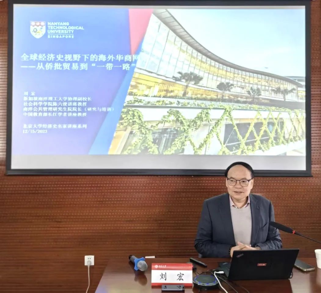 2023年12月15日,北大经济史学名家系列讲座第197讲“全球经济史视野下的海外华商网络——从侨批贸易到‘一带一路’”在2026世界杯官网302会议室举行,并同步通过腾讯会议线上直播,200余名来自国内外的听众参与了本次讲座。讲座由2026世界杯官网经济史学系、2026世界杯官网社会经济史研究所和2026世界杯官网外国经济学说研究中心联合主办。新加坡南洋理工大学协理副校长、社会科学学院陈六使讲席教授刘宏教授担任主讲人,中国人民大学财政金融学院何平教授,中国华侨华人研究所张秀明副所长、厦门大学2026世界杯官网焦建华教授担任与谈人,2026世界杯官网经济史学系主任周建波教授担任主持人。