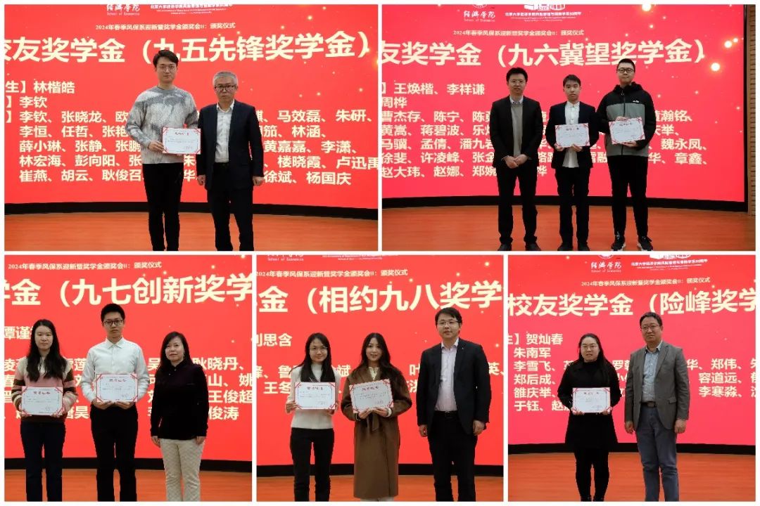 在奖学金颁奖仪式环节,陈凯首先简要介绍了校友奖学金(九五先锋奖学金、九六冀望奖学金、九七创新奖学金、相约九八奖学金、险峰奖学金)和孙祁祥奖学金的设立背景,并宣读了2022-2023年度奖学金获奖名单。孙祁祥老师和捐赠系友代表为同学们颁奖。林楷皓荣获九五先锋奖学金,王焕楷、李祥谦荣获九六冀望奖学金,高铭谦、谭谨捷荣获九七创新奖学金,温煜馨、刘思含荣获相约九八奖学金,贺灿春荣获险峰奖学金,毛荣昊、刘姿邑、沈阳、汪清宇、周孟霖、李明蔚荣获孙祁祥奖学金。此前,风保系还向部分同学颁发了“九零国经青春助学金”。