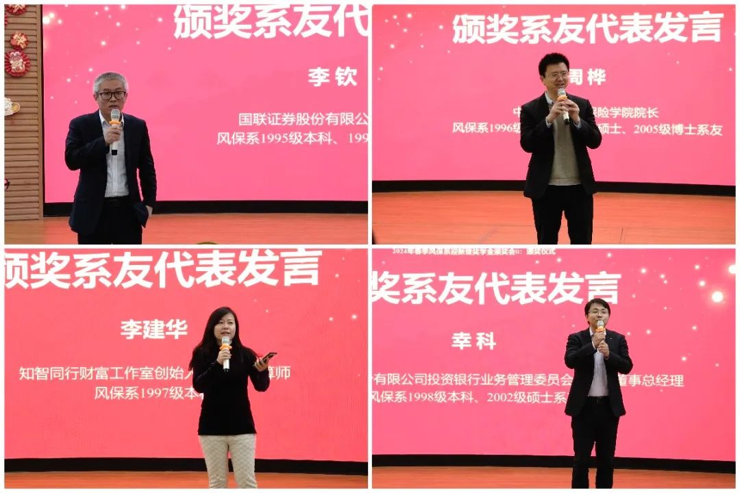 捐赠系友代表依次与在场师生进行分享。风保系1995级本科、1999级硕士系友,现任国联证券股份有限公司副总裁李钦回顾了在校时所见证的风保系筚路蓝缕的创系时期,老师们尽其所能给大家提供最前沿的内容。他希望同学们培养终身学习的习惯,不断提升自我,以更好地适应未来的挑战和变化。