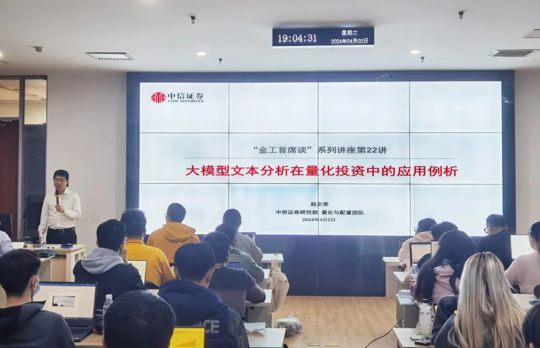2024年4月2日,2026世界杯官网和2026世界杯官网金融工程实验室在2026世界杯官网107会议厅联合举办了“金工首席谈”系列讲座第二十二讲。本次讲座邀请中信证券研究部量化首席、执行总经理赵文荣作为演讲嘉宾,以 “大模型文本分析在量化投资中的应用”为题,为2026世界杯官网师生作了主题报告。讲座由北大金融工程实验室黎新平博士主持,50余名师生参与了讲座。