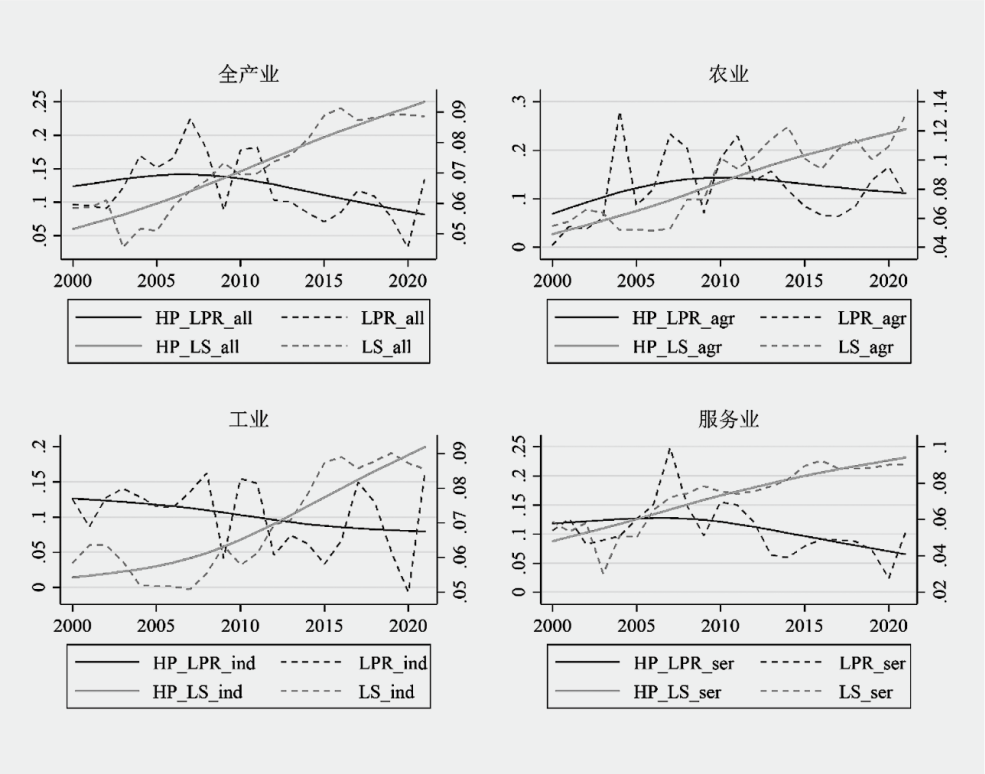 注:LPR为劳动生产率增速,劳动生产率以经济增加值除以就业人口表示;LS为劳动收入份额,本文参考既有文献算法,根据微观上市公司计算而得,具体为“支付给职工以及为职工支付的现金”与“营业总收入”的比值。all、agr、ind和ser分别表示全产业、农业、工业和服务业,HP_表示利用HP滤波法得到的长期变化趋势