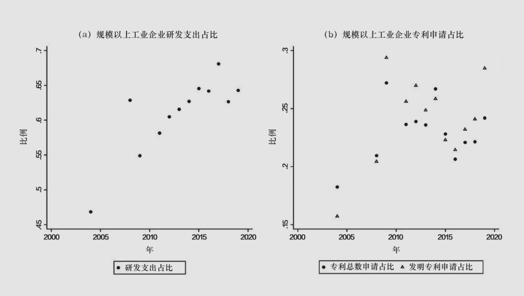 图3 中国规模以上工业企业研发支出、专利申请在全国经济创新活动中的占比