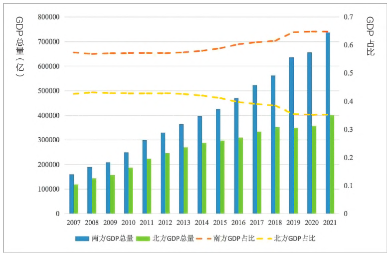 近些年来,我国南北经济发展不平衡的问题逐渐显露(南方地区包括江苏、安徽、湖北、重庆、四川、西藏、云南、贵州、湖南、江西、广西、广东、福建、浙江、上海、海南16个省(自治区、直辖市);北方地区包括山东、河南、山西、陕西、甘肃、青海、新疆、河北、天津、北京、内蒙古、辽宁、吉林、黑龙江、宁夏15个省(自治区、直辖市))。从GDP总量来看,南北GDP总量差距从2007 年的4.1万亿增加到2021年的33.6万亿元,差距不断拉大(图1)。