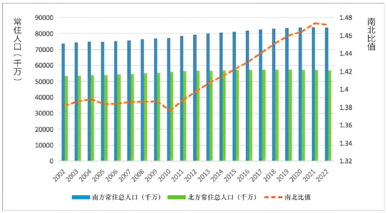 人力资本差异。随着我国人口流动日益频繁,人力资本水平在区域间呈现出差异性分布。从常住人口数量视角来看,2002年以来南方地区常住人口增量较大,北方地区人口增量较小。南北常住人口比值从2010年的1.37增大到2022年的1.47(图3)。此外,根据中商产业研究院的数据测算,2020年南方15—64岁人口数为5.75亿左右,北方15—64岁人口数为3.91亿左右,南北比值约为1.47。总体而言,无论是常住人口数量,还是适龄劳动人口数量,南方地区都具有一定优势。