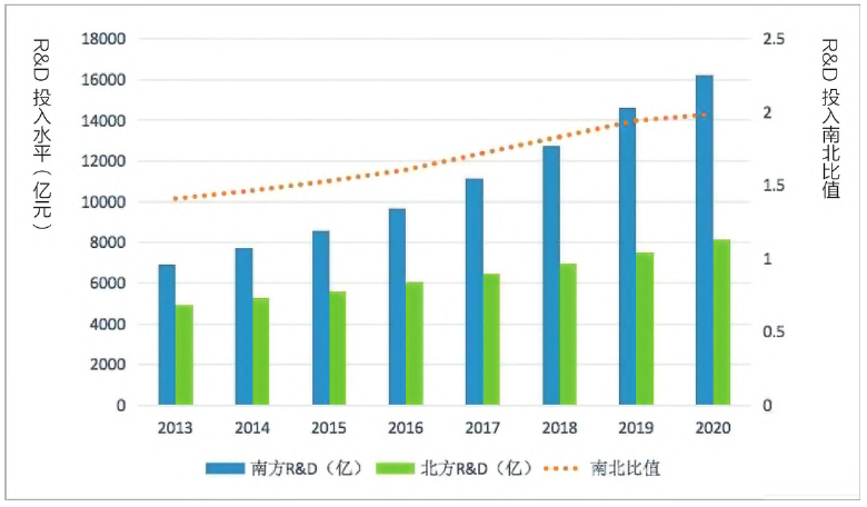科技投入差异。科技创新一直是区域经济发展的核心驱动力,各地致力于实现新旧动能转换,区域创新政策层出不穷,地方政府对科技的投入与支持不断上升。随着科学研发投入的增加,总体劳动生产率也随之提升,从而引导地区产业结构发生转变。因此,有理由认为科技投入力度的差异也是南北经济发展不平衡的潜在驱动因素之一。从图4可以看出,南北R&D投入水平在近十年来都呈现不断上升趋势,但南方科技投入水平要明显地高于北方地区,并且南北之间的比值逐年扩大。截至2020年,南方的R&D投入水平已经是北方的两倍之多。接近两倍的创新投入差距,成为促进南方经济发展、新旧结构转型的重要推动力。而相对不足的科技创新投入使得北方地区的经济结构转型遭遇瓶颈,从而导致了南北经济差距的拉大。