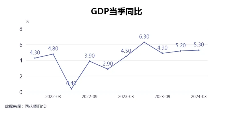 对比2022年至2024年各年第一季度的GDP增速,发现今年一季度GDP增速为三年内同期最高水平。此外,自2022年6月以来,我国第二产业GDP当季同比增速整体呈上升趋势。