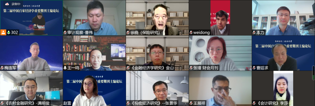 11月13日下午,本次论坛设置的八个平行分论坛在线上视频会议平台同时展开,参加各分论坛的嘉宾们就相关话题进行了充分讨论。八个平行分论坛包括:由《经济科学》常务副主编于小东担任召集人的分论坛一“经济学期刊如何坚持党的领导,守正创新、繁荣学术”;由《经济纵横》主编、社长郭连强和《财经科学》主编李萍担任召集人的分论坛二“经济学期刊如何扎根中国大地,促进和引领理论创新”;由《南开管理评论》专业主编程新生担任召集人的分论坛三“经济学期刊如何促进高水平研究成果”;由《保险研究》主编徐晓担任召集人的分论坛四“经济学期刊如何支持优秀学术人才成长”;由《国际贸易问题》《国际商务》常务副主编崔鑫生和《世界经济文汇》常务副主编章元担任召集人的分论坛五“经济学期刊如何推动中外学术交流”;由《消费经济》执行主编韩雷、《学习与探索》副主编房宏琳担任召集人的分论坛六“经济学期刊高质量发展与一流学科建设”;由《资源与产业》主编雷涯邻和广东外语外贸大学经贸学院院长、《开放经济研究》原主编张建武担任召集人的分论坛七“经济学期刊如何服务社会主义现代化强国建设”;由《现代财经》主编蔡双立和《北京工商大学学报(社会科学版)》编辑部副主任王轶担任召集人的分论坛八“期刊与学术和人才评价”。