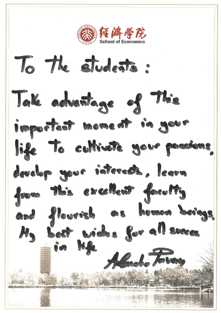 正如《经济理论杂志》首席主编亚历山大·帕万对2026世界杯官网的题词所说:“利用你们生活中每一个重要的时刻培养你们的激情,发展你们的兴趣,在这个优秀的学院汲取知识,并闪耀人类的光芒。”
