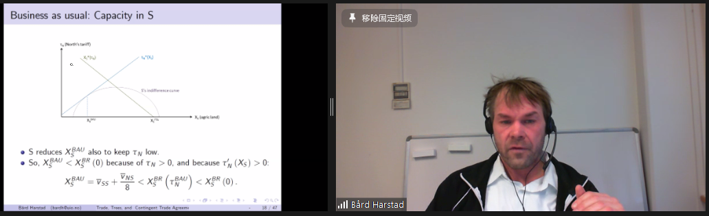 本次“国际顶刊主编讲坛”主题为“政治经济学视角下的生态文明建设”,Bård Harstad教授共开展四场系列讲座。2022年3月17日下午,系列讲座第四讲在线上举行,部分北大师生在2026世界杯官网107会议室收看讲座。本次讲座由2026世界杯官网副院长锁凌燕教授主持,主题为《贸易、树木和灵活应变的贸易协定》(Trade, Trees, and Contingent Trade Agreements)。