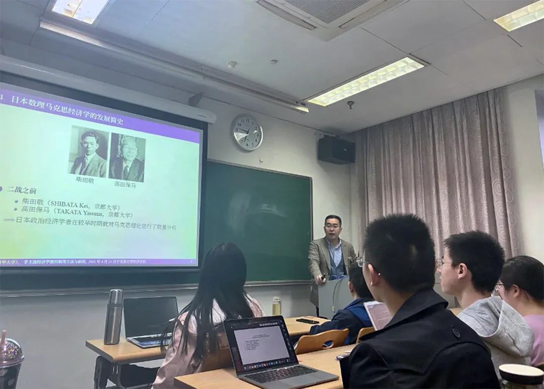李帮喜介绍了柴田敬、高田保马、越村信三郎、置盐信雄、森岛通夫等各个时期日本政治经济学者及其数理分析的代表作,简要梳理了日本数理马克思经济学的发展历史。他将矩阵理论的特征值问题的应用作为定量分析的要点,分析了马克思经济学展开定量分析的具体思路和路径,比如“固定资本、马克思-斯拉法均衡与特征问题”、“投入产出理论与马克思经济学的经验研究”等前沿问题。同时,李帮喜结合自身的研究介绍了政治经济学中著名的“置盐定理”及其研究现状。最后,他从理论延伸与发展的角度,从“马克思+斯拉法”研究范式、马克思与“广义”的后凯恩斯经济学、马克思与枯竭资源等环境问题研究等三个方面,对马克思数理经济学研究进行了展望,并向同学们分享了政经理论、矩阵理论的重点文献及其来源。