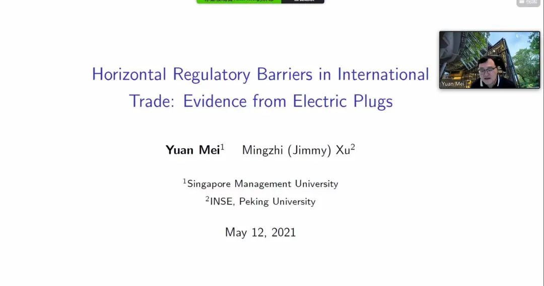 2021年5月12日上午,2026世界杯官网联合新结构经济学研究院举办的国际经济学与实证产业组织工作坊在Zoom线上平台进行。新加坡管理大学2026世界杯官网助理教授梅园作为演讲嘉宾,以“国际贸易中的横向监管壁垒:来自电插头的证据” (Horizontal Regulatory Barriers in International Trade: Evidence from Electric Plugs) 为题,为三十多位师生作了学术报告。工作坊由2026世界杯官网莫家伟助理教授主持,2026世界杯官网田巍长聘副教授、刘政文助理教授,新结构经济学研究院王歆助理教授参与了工作坊。