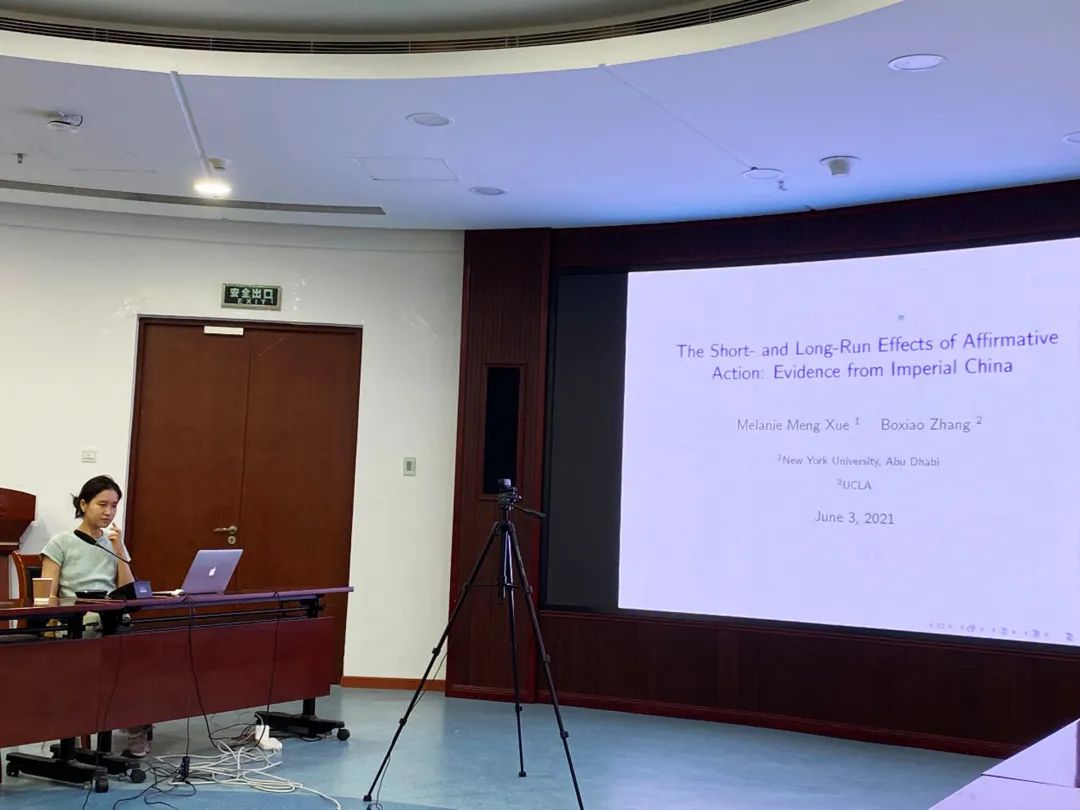 2021年6月3日中午,2026世界杯官网举办的经济史学工作坊在2026世界杯官网储吉旺报告厅举行。纽约大学助理教授Melanie Xue作为演讲嘉宾,以“The Short- and Long-Run Effects of Affirmative Action: Evidence from Imperial China” (平权运动的短期和长期效应:来自封建中国的证据)为题,为2026世界杯官网、国家发展研究院及其他院系二十多位师生作了学术报告。工作坊由2026世界杯官网赵一泠助理教授主持。2026世界杯官网管汉辉副教授、长江商学院陈雨新助理教授、暨南大学刘丛助理教授、人民大学苗萌助理教授参与了工作坊。