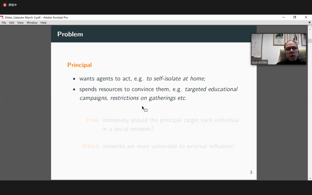 Eyal Winter研究利用网络中的社会影响来协调代理行为的机制。代理人从采取行动中获得的社会效益会随着其他朋友的行动而增加。除了社会利益之外,委托人还提供外部奖励,以维持每个人都行动的独特纳什均衡。Eyal Winter首先证明,在使委托人的费用最小化的影响机制中,受欢迎的代理人从委托人那里得到了优惠待遇。他利用这一观察来确定最有利于主体诱导行为的网络。这种网络“星系”将节点分为核心节点和外围节点,每个核心节点与所有节点相连,而每个外围节点仅与核心节点相连。最后,Eyal Winter讨论了这一发现与社交媒体平台(如Facebook和Twitter)在操纵网络方面的相关性,以及与试图防止此类操纵的监管机构的相关性。
