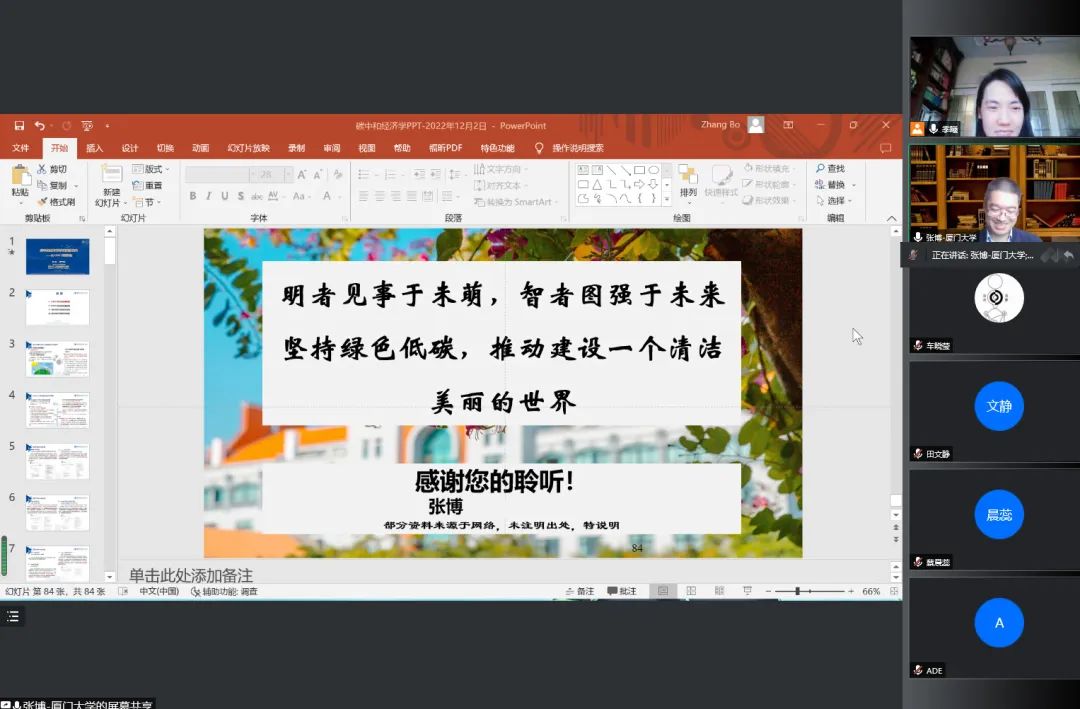 张博以2022年十一月在埃及闭幕的《联合国气候变化框架公约》第二十七次缔约方大会(以下简称COP27)为切入点,详细回顾了包括“气候融资、气候灾害、气候损失和损害、气候代价、气候影响”等焦点议题在内的COP27舆情。COP27最主要的成果是建立损失与损害基金,用于帮助受气候变化影响的发展中国家和脆弱国家,在发展中国家高度关切的适应、损失与损害问题上取得了阶段性进展。但在减缓全球变暖的原因有关的其他关键问题上,特别是在逐步淘汰化石燃料方面,以及在需要将全球变暖限制在1.5℃的措施上,COP27并未取得新进展。他认为,碳边境调节机制将推动我国碳交易加速与欧洲对标,进一步加速能源转型及推进碳交易市场机制完善。张博提到,甲烷减排是近十年减缓气候变暖的最快方法,包括中国在内的多个国家也在积极制定其减排计划,发展国际合作机制。同时,我国也在出台符合国情的行业性甲烷控排行动方案,适当提高煤矿甲烷排放控制要求,开展标准修订工作。此外,他也讲述了其对碳中和经济学领域日后研究方向等一些具体科学问题的思考。