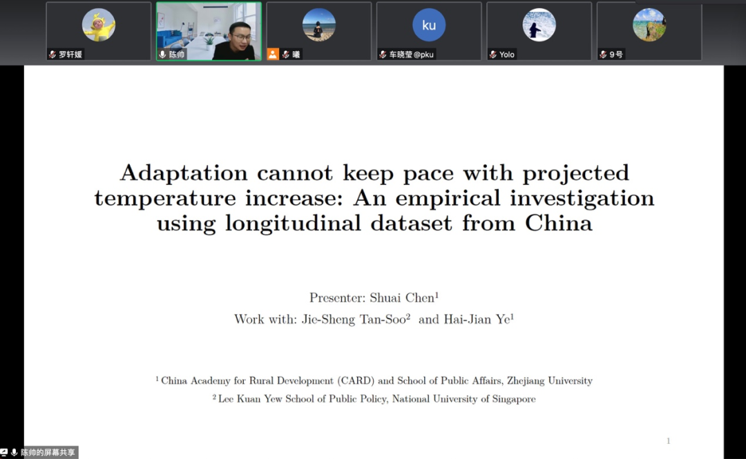 陈帅教授向大家分享了自己与合作者近期在气候变化话题上的有关研究。首先,他对研究背景进行了介绍,指出人们在身体机能上、心理上、经济上都在不断地适应气候变化,从而不同特征的人对气候异常的感知不一样。人们会根据自己过去的经验对现在的气候变化作出判断,比如生活在温暖地方的人相对于生活在寒冷地方的人对于气温升高可能没那么敏感,不同年龄的人因为气温参考区间的不同对于气温变化的认知也不一样。由于人们在不断地适应气候变化,对于减缓气候变化的支付意愿可能随之降低,从而对相关的政策执行产生负面影响。接着,陈帅教授回顾了与全球变暖、适应气候变化相关的文献,表明了现有文献在刻画个人气候异常感知上的不足。