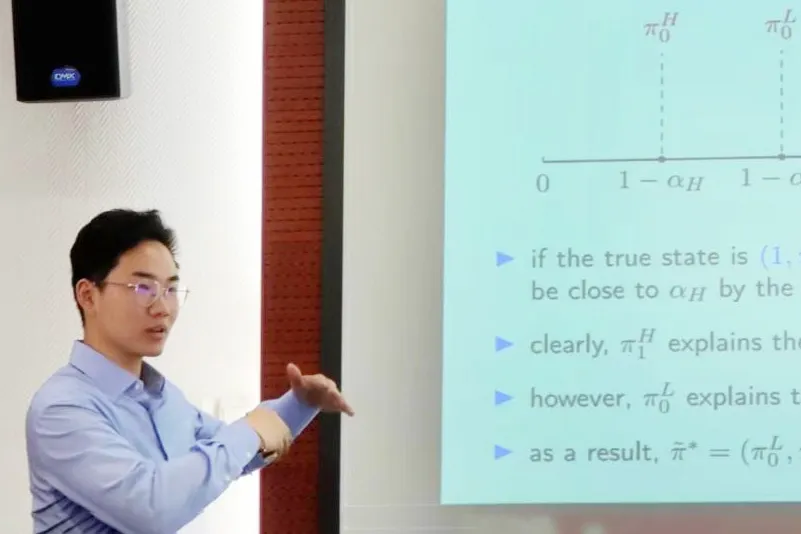在本次报告中,闵炜程汇报了决策者对多个信息源的动态选择的研究。他首先通过示例讲解本研究的设定:在每一期都存在两个信息源,分别为结构已知的熟悉信息源和结构不确定的陌生信息源,决策者可以从中选择其一从而使自己获取尽可能多的信息。在该示例中,陌生信息源的平均信息量更大,但决策者最终还是会选择熟悉的信息源。随后,闵炜程将这一过程推广到无限期,此时决策者不仅需要对真实状态进行学习,还需要推测不熟悉信息源的结构。他说明了信息源的有效程度不取决于决策者的先验认识,而是取决于信息源与真实状态之间的相关性。通过一系列分析,闵炜程证明了决策者将在某一时点及其之后所有时期都选择熟悉的信息源,即使陌生信息源Blackwell占优熟悉信息源也是如此。最后,他简要介绍了本模型可能的拓展方向,如两个信息源都存在不确定性。