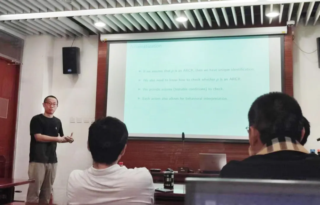 在本次报告中,汤睿分享了决策中的联想网络问题。心理联想是一种重要现象,它根据先前的经验将一件事物与另一件事物联系起来,是影响记忆和注意力的关键渠道。汤睿研究了心理联想如何影响决策者的注意力和最终的选择,在他的模型中,决策者随机地关注可选项的一些子集,并通过心理联想扩大他可注意到的集合,最终在扩大的集合里选择最优的选项。汤睿在随机注意框架下证明了模型中所有相关参数都是唯一可识别的。值得注意的是,那些不可行但可观察到的替代方案的存在会通过心理联想这一渠道影响选择频率。最后,汤睿介绍了模型可能的拓展方向,比如可以考虑更一般的注意框架,使用随机网络或随机偏好等。