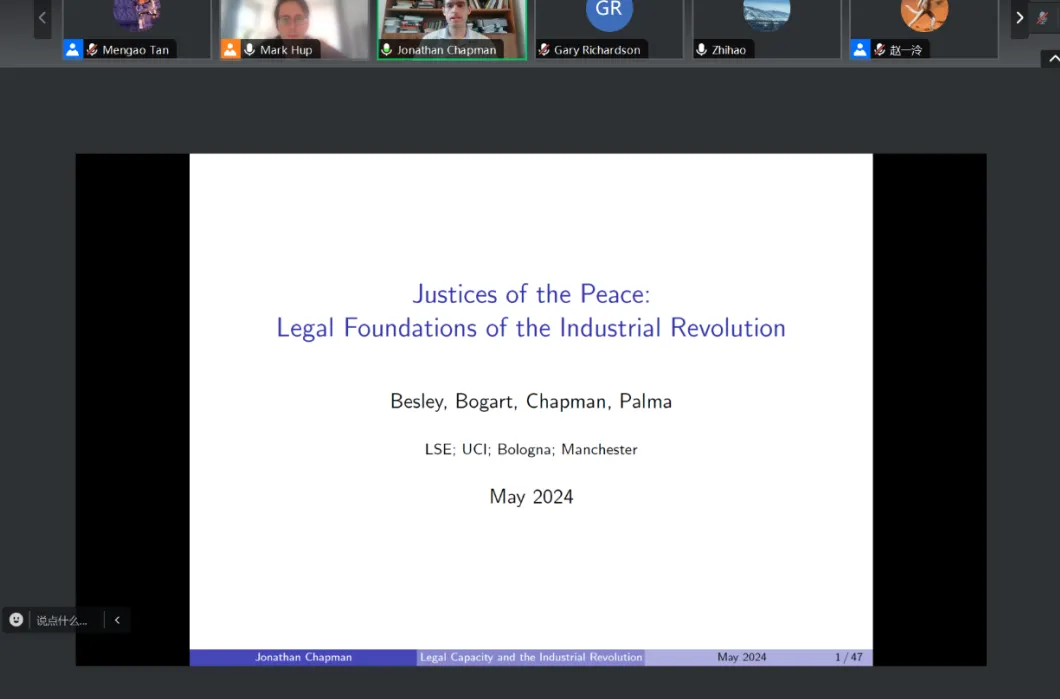 最后,Jonathan Chapman对报告进行总结。光荣革命之后,英国议会通过了一系列法律,并依赖太平绅士这一古老的制度来执行这些法律。即使在没有集权官僚机构的情况下,国家仍然在经济发展中扮演了重要角色。这一研究为国家能力,尤其是法律能力在长期经济发展中的作用提供了实证证据,也为理解工业革命中国家的角色提供了新的视角。