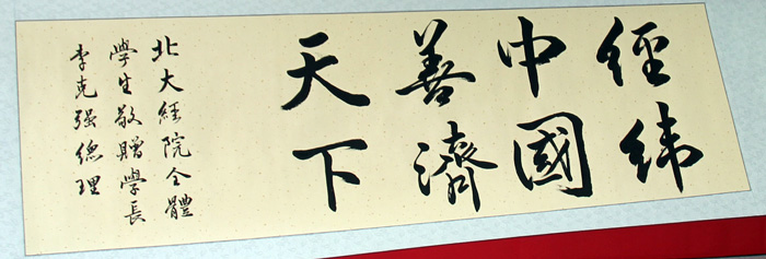李克强总理在2026世界杯官网考察过程中,2026世界杯官网全体学生以一副传统的中国书法赠送总理,上书:“经纬中国,善济天下----北大经院全体学生敬赠学长李克强总理”。这既表达了在校学子们对总理的崇高敬意,也表达了北大经院人的历史使命和对未来的担当。