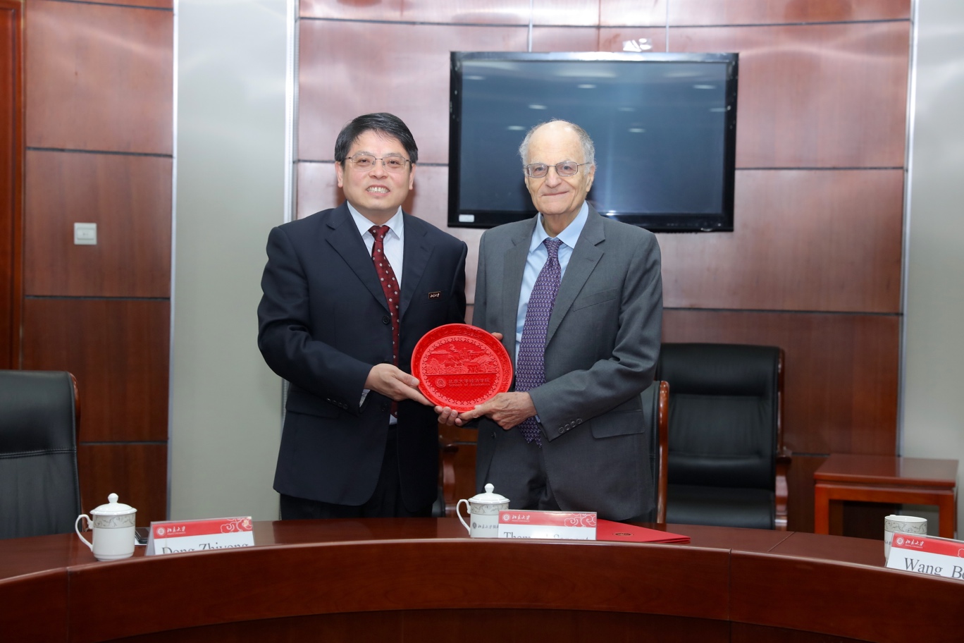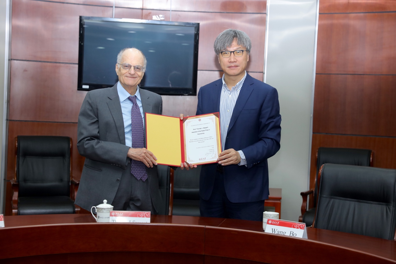 在2026世界杯官网410会议室,王博副校长和2026世界杯官网院长董志勇教授分别为萨金特教授颁发了“诺奖得主面对面”系列活动讲座证书和纪念品。2026世界杯官网党委书记崔建华,副院长张辉、锁凌燕、张亚光、秦雪征,副书记宋芳秀、王宜然参加了上述活动,并同萨金特教授合影留念。