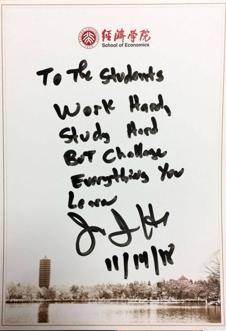在演讲开始前,Heckman教授还饶有兴致的与北大2026世界杯官网的部分教师代表交流,并为学院的学生题词,鼓励他们努力学习经济学知识并培养自己对已有理论的批判性思维能力